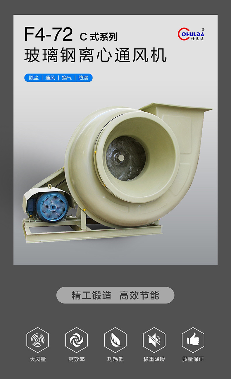 F4-72型玻璃钢离心通风机、是参照金属4-72型通风机性参数而采用玻璃钢复合材质制作而成。该系列风机可输送含酸碱成分及化学成分的腐蚀性气体。所输送气体不允许含有粘性物质、所含粉尘及硬质颗粒≤150mg/m3、气体温度≤60℃、相对湿度≤100%。该系列风机具有强度高、重量轻、不易老化、耐腐蚀性能良好、噪音低、运转平稳等特点。是一种较为理想的通用型防腐风机。该系列风机广泛应用于化工、电镀、氧化、发电厂、化验室、线路板、环保设备等含有腐蚀性气体的场所。