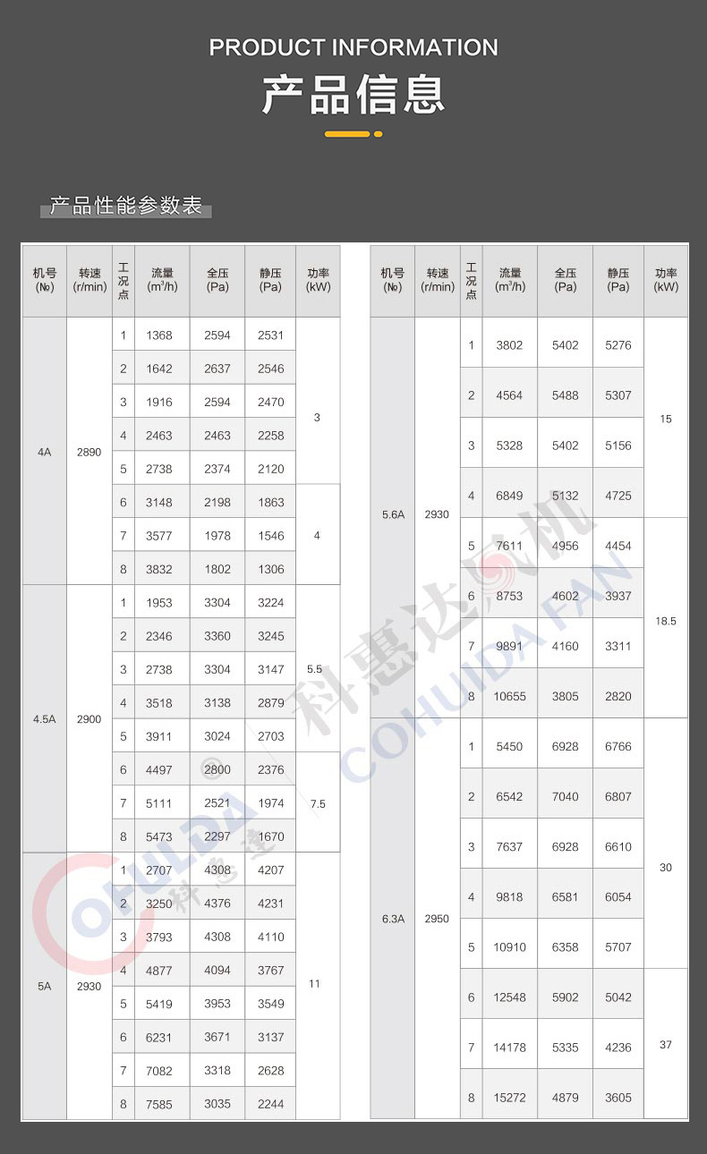 6-35系列风机,采用单吸入式后倾叶轮,属于小流量、中压型离心风机。本系列风机有№4#、4.5#、5.6#、6.3#、7.1#、8#、9#、10#、11.2#、12.5#共11个机号,其中,机号№4~7.1有A式和C式两种传动方式;№8~12.5采用C式传动。